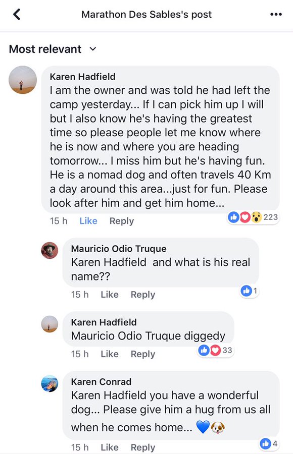 Até que, a sua dona, após ter visto que um cachorro estava fazendo a maratona, entrou em contato com a página de facebook da Des Sables, dizendo que era a dona do cachorro, que ele é um cachorro nômada e que percorre 40km por dia só por diversão. Ah, e que o seu nome verdadeiro é Diggedy.