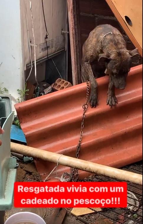 Ela vivia num verdadeiro lixão fechado, acorrentada com um cadeado no pescoço.