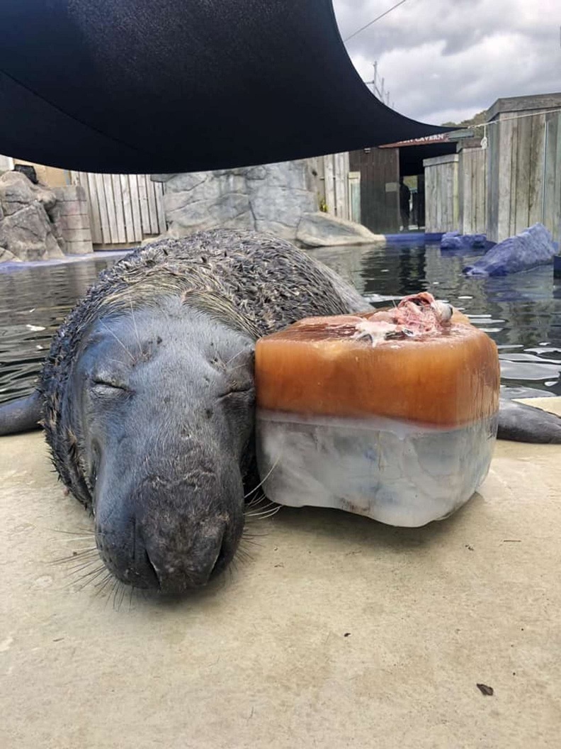 Para comemorar o 31º aniversário do mamífero, os funcionários da Cornish Seal decidiram presenteá-la com um bolo de gelo recheado de peixe.