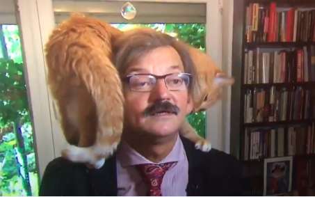 Pode-se imaginar que isso, durante uma entrevista, seria uma enorme distração, mas como mostram as imagens da entrevista, Targalski não perde o ritmo nem o controle. Podem os então assumir que esta não seja é a primeira vez em que ele é transformado no poleiro do seu gato.