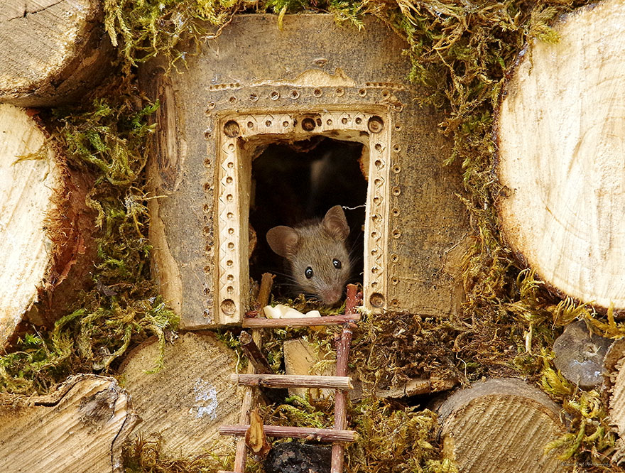 Recentemente, o fotógrafo Simon Dell meio que tropeçou em uma família de ratos correndo em seu jardim e em vez de procurar as armadilhas para os apanhar, decidiu colocar mãos à obra e pegar em suas ferramentas. Dell construiu uma vila em miniatura para os animais e eles retribuíram posando em frente a sua câmera.