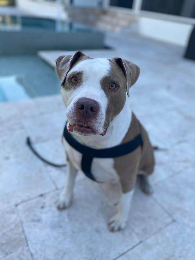 O pobre cão abandonado foi descoberto por uma mulher em Orlando, Flórida, quando ela saiu de casa, percebeu que havia um cachorro deitado no quintal. Era um pit bull marrom e branco que estava amarrado a árvore pela cólera. Ela também encontrou um bilhete ao lado do cão.