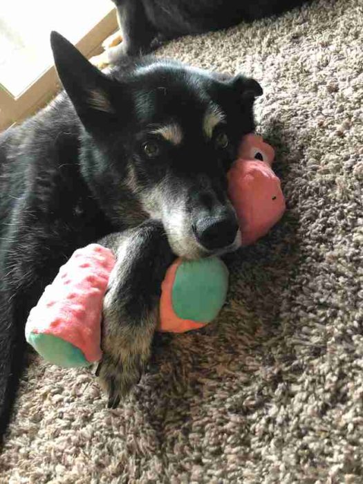 Esse é o sorriso de um cachorro com um brinquedo novo... Isso é uma prova de que não importa a idade para brincar.