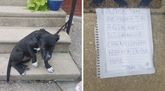 Imagina a cena: uma cadela foi abandonada amarrada a uma grade com um bilhete de despedida do 'ex-dono' e alguns pedaços de pizza.