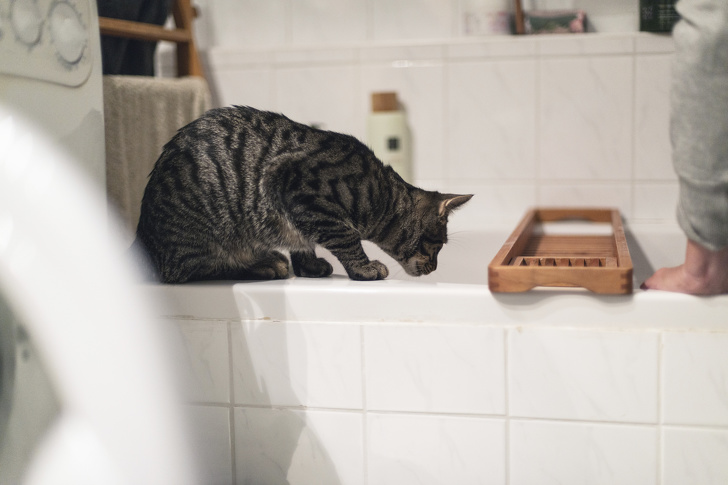 Curious tabby cat on edge of bath watching flowing water.