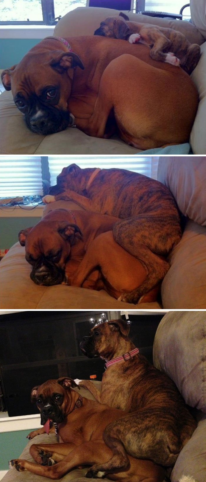 #2 O nosso Boxer filhotinho, deitado em cima do nosso Boxer adulto...