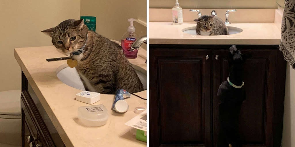 Gato descobre que irá viver com cachorro - e decide 'viver' na pia do banheiro