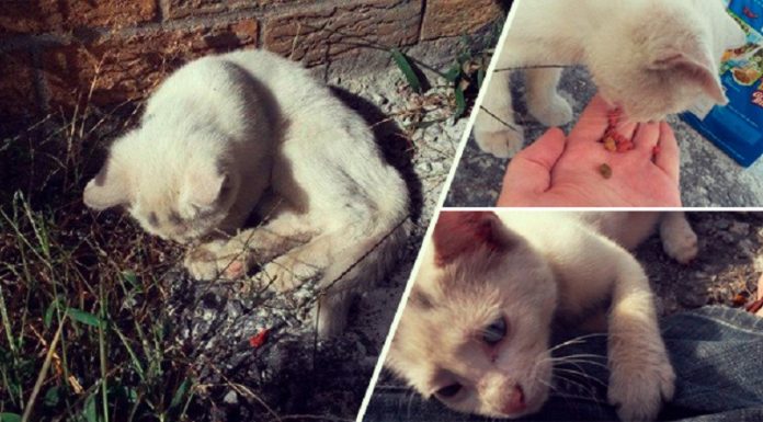 Um jovem encontrou esta pequena gatinha no meio de uma rua movimentada, pegou nela e colocou-a no camião. "Eu encontrei esta bolinha de pelo...