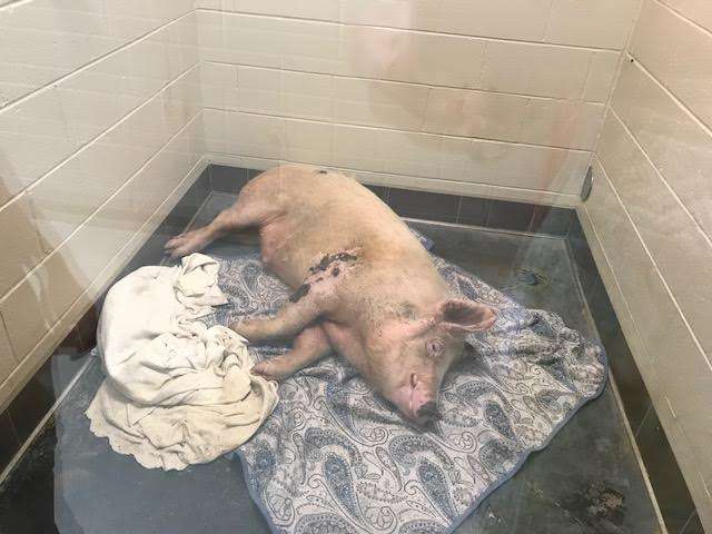 E assim poderia ter sido o fim para este porco se um estranho não parasse e ligasse para a emergência. No momento em que a polícia chegou, os cães tinham ido embora, mas o porco, que tinha cerca de 6 meses, estava gravemente ferido e sangrando.