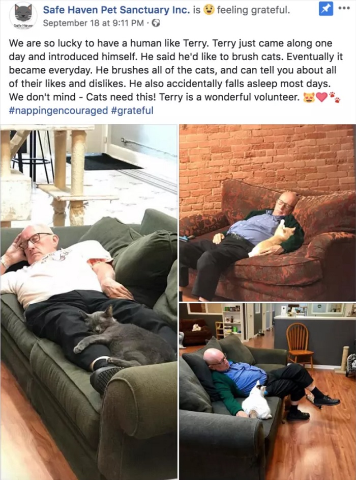 "Somos muito sortudos por ter um humano como o Terry", escreveu o abrigo, junto com algumas fotos de Lauerman dormindo com osfelinos. “Terry apareceu um dia e se apresentou. Ele disse que gostaria de escovar gatos. Eventualmente, isso se tornou em visitar diárias. Ele escova todos os gatos e nos fala sobre os gostos de cada um deles. Ele também acidentalmente adormece na maioria dos dias. Mas nós não nos importamos - os gatos precisam disso também! Terry é um voluntário maravilhoso.