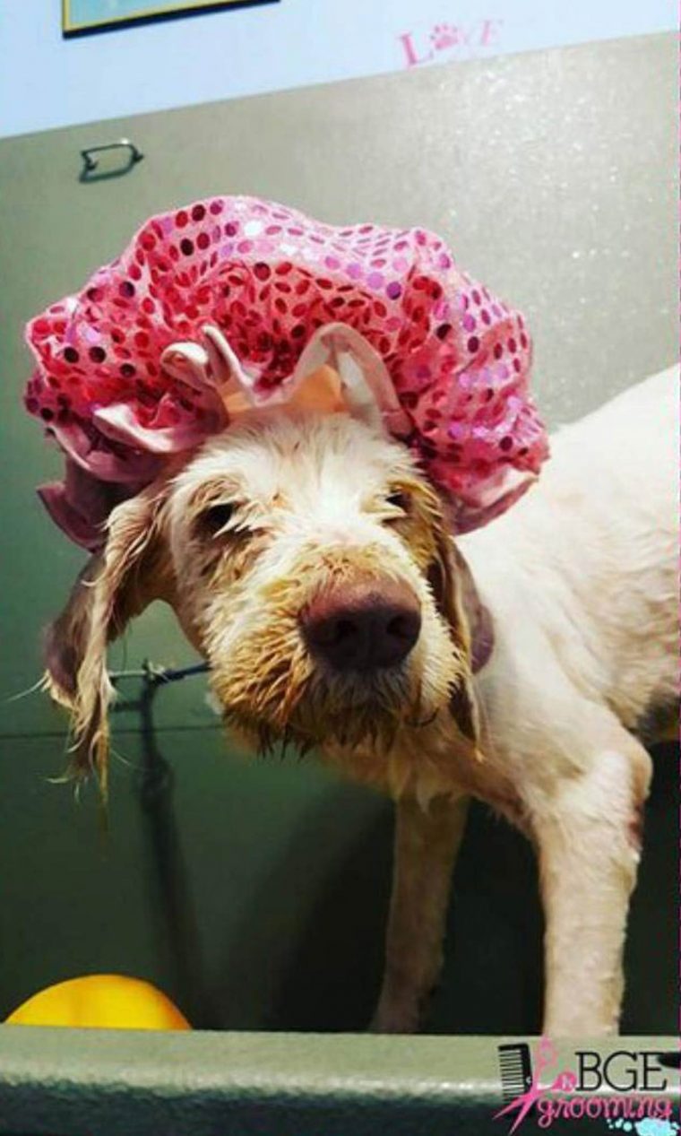 Lucky recebeu, o que muitos pensam ser, o primeiro banho de sua vida!
