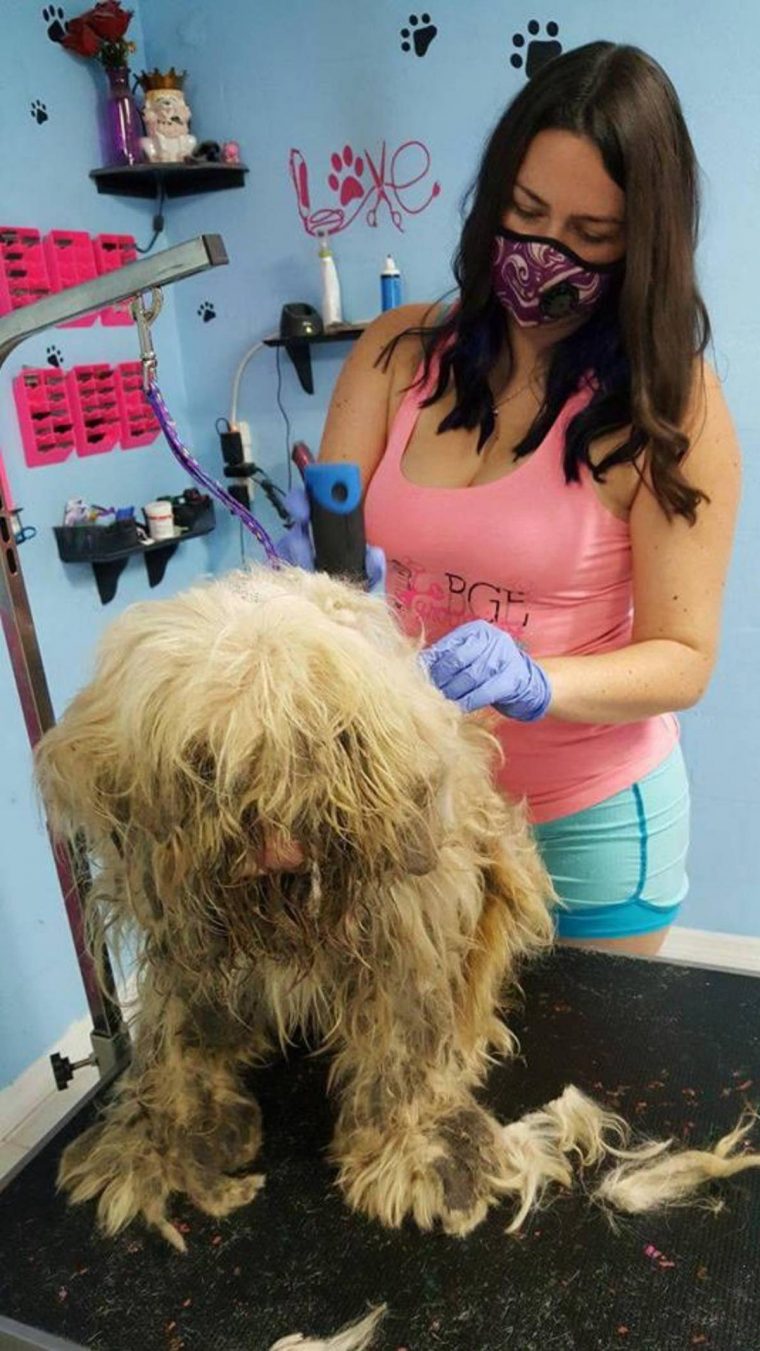 Durante três horas, Falla começou a libertar Lucky de sua “prisão” de pêlo emaranhado.