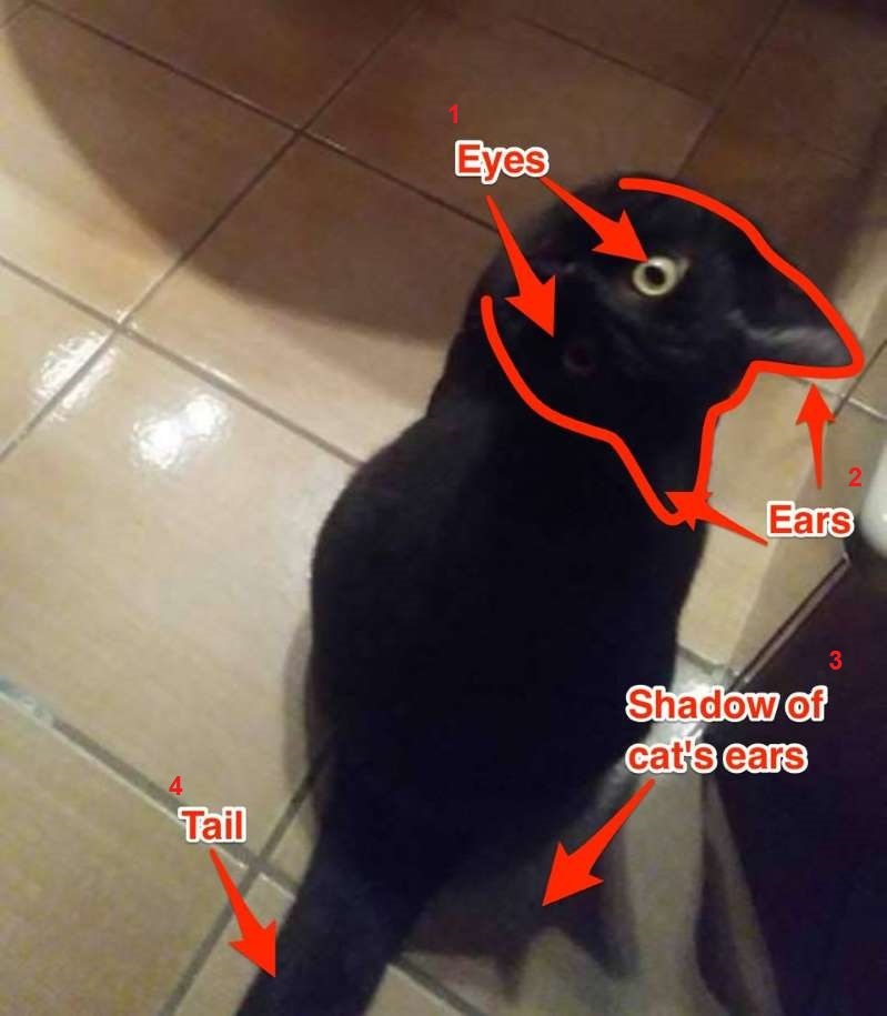 1 - Olhos / 2 - Orelhas / 3 - Sombra das orelhas do gato / 4 - Cauda